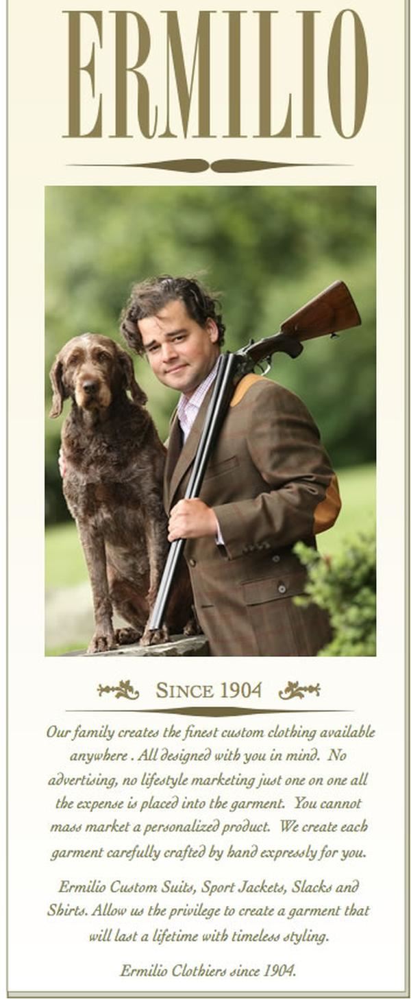 For the discriminating shooting and hunting enthusiast, Ermilio Clothiers & Specialty Shop Ltd has donated a $1,500 gift certificate toward the cost of a men's custom bespoke shooting suit. Your custom suit will be specially designed and tailored to your measurements for the utmost in comfort and performance. Must be used toward custom work. Cannot be combined with any other gift certificate or promotion. Expires 8/1/2021. Ermilio Clothiers was Eisenhower's Tailors and created the first Eisenhower jacket for WWII and the first Augusta Green Masters Golf Jacket, as well as creating garments for Grace Kelly. For more information, contact Robert Ermilio at 610-613-6793.