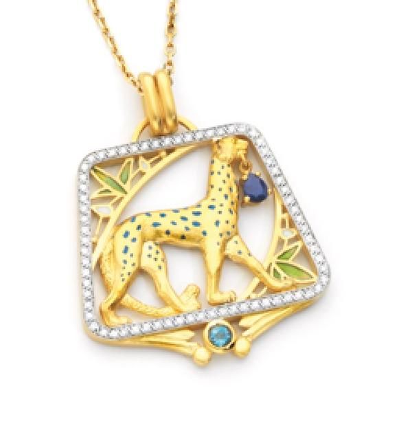Elizabeth & The Gold Lady has donated an 18K Gold Pendant/Brooch 'African Dream.' Made in 18 karat yellow gold, diamonds, one round cut aquamarine, one pear cut blue sapphire and fired enamel, the elegant movement of the stylized leopard transports us to the warm and peaceful scenery of the African savannah. For more information, contact Ms. Sandra Turner 925-837-7779.
