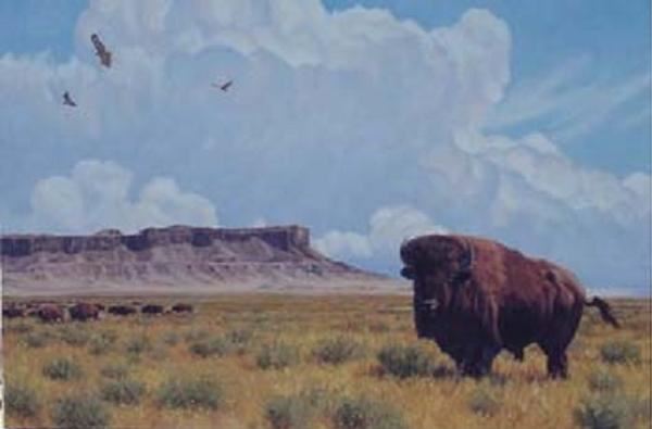 Brian Welker has donated this Lindsay Scott an Original Oil on Linen titled 'Timeless Land' by wildlife artist Lindsay Scott. Artist Lindsay Scott captures the essence of the awe-inspiring vastness and beauty of the North American continent and its majestic animals in detailed oil paintings and pencil drawings filled with emotion. The piece, measuring 40-in. by 60-in. depicts an old warrior overlooking the herd's safety.