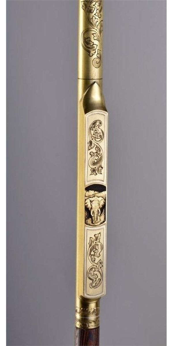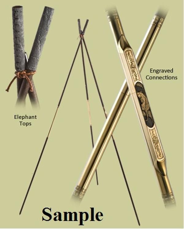 African Sporting Creations has donated Presentation Grade African Shooting Sticks. This is a joint donation between New England Custom Guns and African Sporting Creations. Mark Peterson of New England Custom Guns does all the engraving work on the solid brass connectors and Jim Morando of African Sporting Creations turns the African Wenge shafts and hand-sews the African elephant tops. This one-of-a-kind piece took over 100 hours to complete. The top and bottom of all six connectors are adorned with elegant silver fern borders. The image of the African elephant is built on a Dangerous Game Quarter Rib with sterling silver accents. For more information, contact James K. Morando 419-961-6900 and visit www.africansc.com.