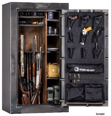 The Rhino Metals safe features 80 minute fire protection at 1400F with full coverage fire lining, ball bearing drill plate and spring loaded re-locker protecting the Lock, UL listed direct-drive electronic lock, patented anti-tamper clutch handle, deluxe door organizer, internal electrical/USB outlet, unique antique finish exterior with leatherette interior, pre-drilled for compatible patented swing out gun rack, and limited lifetime warranty.