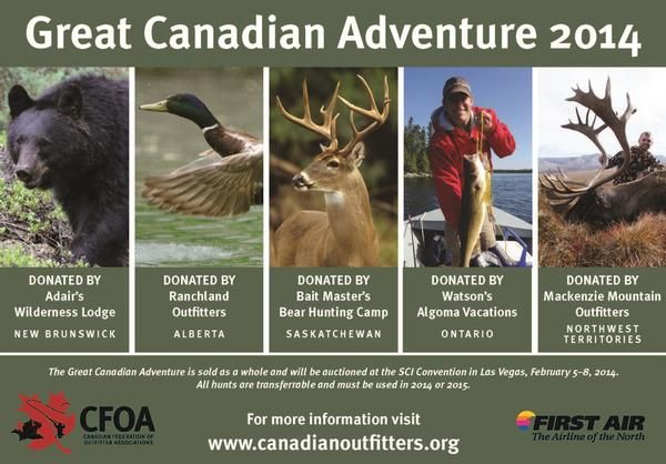 The Canadian Federation of Outfitter Associations (CFOA) is proud to offer a unique adventure package at the 2014 SCI Convention. The package consists of hunting and fishing trips in five different Canadian provinces and territories. This allows the winning bidder to visit a wide variety of landscapes and hunting grounds, and some of the nicest rivers in Canada. The Great Canadian Adventure includes: 1) a mountain caribou, wolf, and wolverine hunting trip in the Northwest Territories; 2) a black bear hunt in New Brunswick; 3) a duck and geese hunt in Alberta; 4) a duck hunt and fishing trip in Ontario; 5) a northwestern white-tailed deer hunt in Saskatchewan. All adventures are provided by some of the most reputable outfitters in Canada. These trips can be taken in 2014 or 2015 (check individual outfitter for more information). It is recommended that the winning bidder contacts each individual outfitter before April 1st 2014. More information is available on the CFOA website http://canada-outfitters.com/ MacKenzie Mountain Outfitters Ltd will conduct a 7-day, 2x1 guided mountain caribou, gray wolf, and wolverine hunt for two hunters. Method of take will be either rifle or bow. Schedule hunt with outfitter for open dates in September of 2014 or 2015. No alternate dates are available. This hunt includes trophy fees for donated game for two hunters, meals, accommodations, 2x1 guide service, and field prep. Trip comes 'as is'; no additional hunters, observers, or extensions are possible. Not included are licence ($100), tag ($400), any before/after hunt expenses, CITES permit (only if wolf is taken), and gratuities. Arrival/departure point is Edmonton. First Air flights to/from Norman Wells included. For more information, contact Stan Stevens by phone at 250-719-8340 or by vising booths 3774 & 3776 at the 2014 Convention in Las Vegas. Company website: www.mmo-stanstevens.com. Adair's Wilderness Lodge will host one hunter on a 5-day, 2x1 guided hunt for black bear in New Brunswick. Method of take is rifle or bow. Schedule with outfitter for open dates May-June or October of 2014 or 2015. No alternate dates are available. Included are cabin accommodations, meals, guide service and field prep. Additional hunters are welcome for $3,100 and observers for $800. Not included are firearm permit, tag ($185), dipping/packing and shipping and gratuities. Arrival/departure point is Sussex, New Brunswick. For more information, contact Larry or Ida Adair at 506-432-6687 or by email at adairs@nbnet.nb.ca. Company website: http://www.adairswildernesslodge.com/ Two hunters will head to Alberta with Ranchland Outfitters to hunt ducks and geese. This hunt can be scheduled with the outfitter for available dates in September or October of 2014 or 2015. No alternate dates are available. Included are meals, accommodations, licence/tag, and field prep. Additional hunters are welcome for $2,850 per hunter. Not included are any before/after hunt expenses and gratuities. Arrival/departure location is Edmonton. For more information, contact Rob Reynolds by phone at 780-210-0411 or by fax at 780-724-2665. Company website: www.ranchlandoutfitters.com. The Ontario portion of this adventure will be hosted by Watson's Algoma Vacations. Here two hunters/anglers will get the chance to hunt ducks and fish for walleye and Northern pike for 3-days with 2x1 guide service. Schedule this trip with outfitter for open dates during the fall of 2014 or 2015. No alternate dates are available. Included are meals, accommodations, 2x1 guiding, air charter, and fish freezing facilities. Not included are any before/after hunt expenses, licence (approx. $200), and gratuities. Arrival/departure location is Wawa, Ontario. For more information, contact Betty McGie by phone at 800-363-4443 or by email at watsons@fishthefinest.com. Company website: www.fishthefinest.com. The Great Canadian Adventure will also include a 5-day, 2x1 guided Northwestern white-tailed deer hunt with Bait Master's Bear Hunting Camps Ltd. for one hunter and one observer. Method of take can be rifle, bow, crossbow, or muzzleloader. Schedule this hunt with outfitter for open dates from November 1-December 5, 2014 or 2015. No alternate dates are available. Included are meals, accommodations, trophy fee for one white-tail, 2x1 guide service, and field prep. Extra hunters are welcome for $5,000 (not including HIC or tax) and observers for $1,500. Not included are any before/after hunt expenses, ground transport ($500), dip/pack, and gratuities. Arrival/departure point is Saskatoon. For more information, contact Brian or Sylvia Hoffart by phone at 306-832-2084 or by email at baitmaster@sasktel.net. Company's website: www.baitmaster.net. For more information abouth this one of a kind package visit: www.canada-outfitters.com